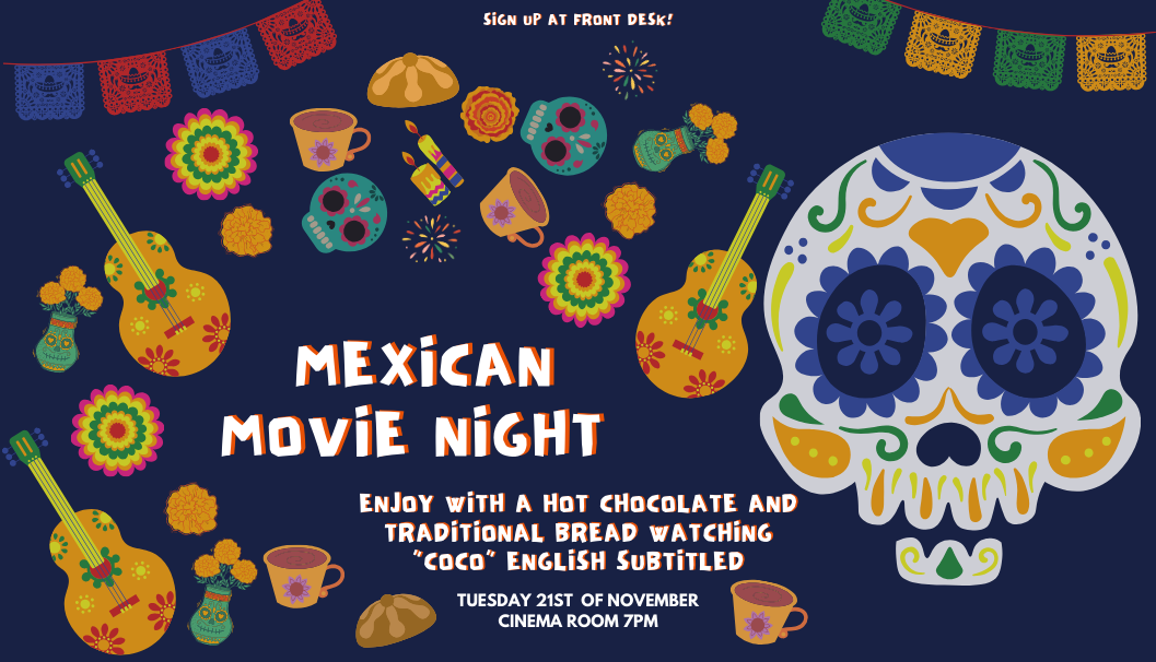 Enjoy with a hot chocolate and traditional bread watching “Coco” with English-subtitled. This event promises a memorable exploration of Mexican traditions, cinematic excellence, and a feast of flavors and colors that celebrate the essence of Mexico’s Day of the Dead. Don’t miss the opportunity to experience the magic of Mexican culture in one enchanting night.